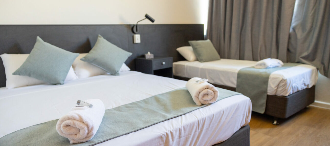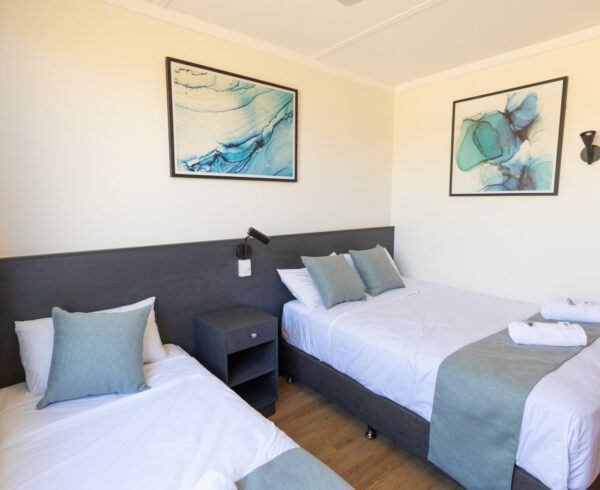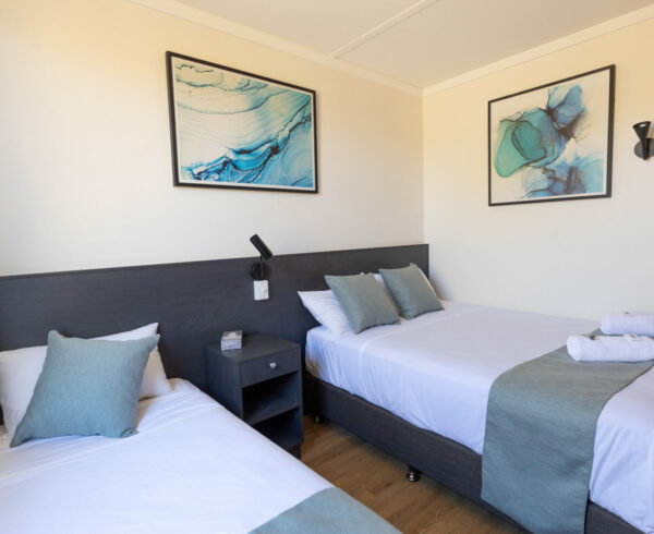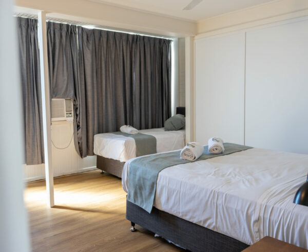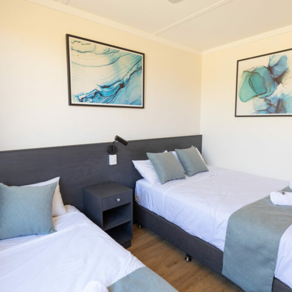Sleeps three adults, newly renovated room equipped with 1 Queen and 1 King Single bed, ensuite, air-conditioning, 40” TV, bar fridge, tea & coffee making facilities, toaster, toiletries, iron facilities, luggage holder and desk. Iron available upon request.